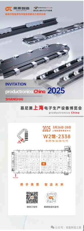 2025年3月26-28日,全球电子制造最高殿堂——慕尼黑上海电子生产设备展,果栗智造将在W2馆-2338展位重磅亮相磁悬浮智能柔性传输技术: